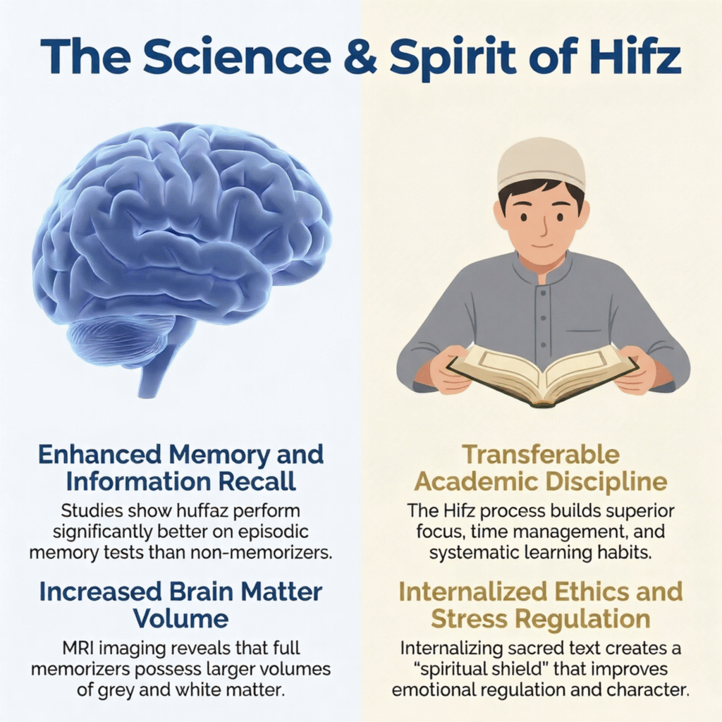 Becoming a Hafiz means memorizing all 114 chapters of the Quran in Arabic and retaining them for lifelong recitation. This sacred journey offers benefits far beyond spiritual rewards: scientifically proven cognitive improvements, enhanced character development, and measurable brain health advantages. Whether you’re a parent considering this path for your child or exploring it yourself, understanding these transformative benefits helps you make an informed decision.