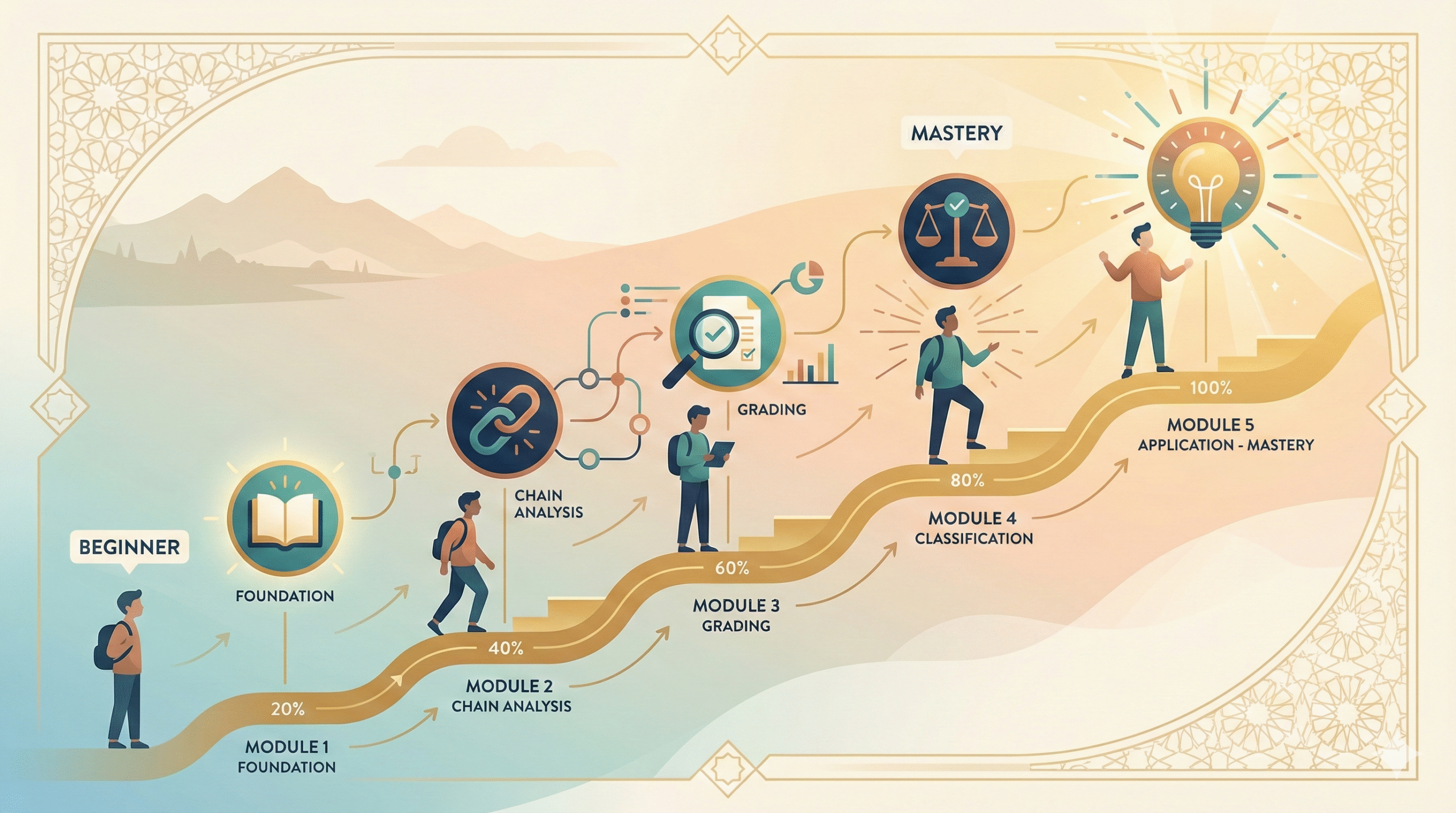 We’ve distilled centuries of classical Hadith scholarship into a clear, progressive system that transforms complete beginners into confident authenticators. Each stage builds essential skills systematically no confusion, no gaps, just proven results.