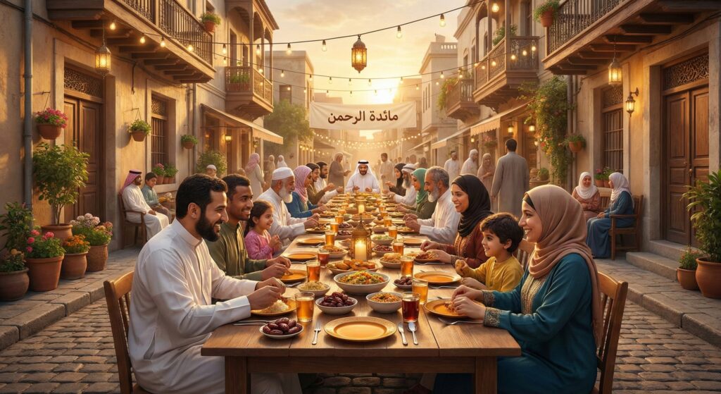 Across Morocco and throughout North Africa, communities set up long tables on public streets offering free iftar meals to anyone who needs them. These “Tables of Mercy” (Mawaeed Al-Rahman) embody Ramadan’s charitable spirit by ensuring no one breaks their fast alone or hungry.