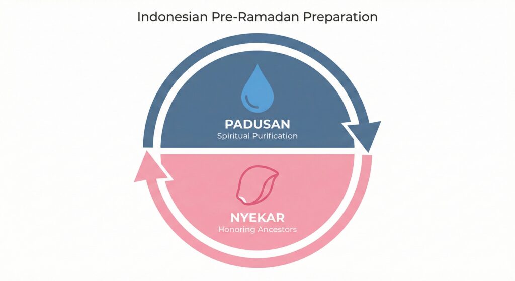 Before Ramadan begins, Indonesian Muslims participate in Padusan, a spiritual bathing tradition performed in natural springs, rivers, or designated public bathing areas. This practice represents both physical cleanliness and spiritual purification as communities prepare to enter the holy month.