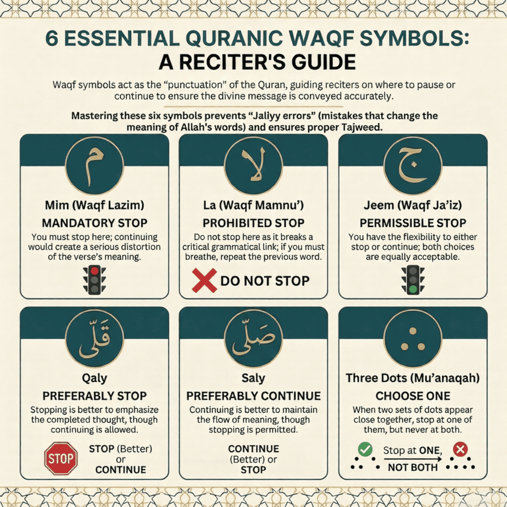 The beauty of waqf is that it’s simultaneously simple and profound. The symbols are straightforward. The impact on meaning is revolutionary. Whether you’re a beginner taking your first steps in Tajweed or an advanced student refining your recitation, returning to these fundamental pause rules always reveals new layers of wisdom in how Allah chose to preserve His final message to humanity.